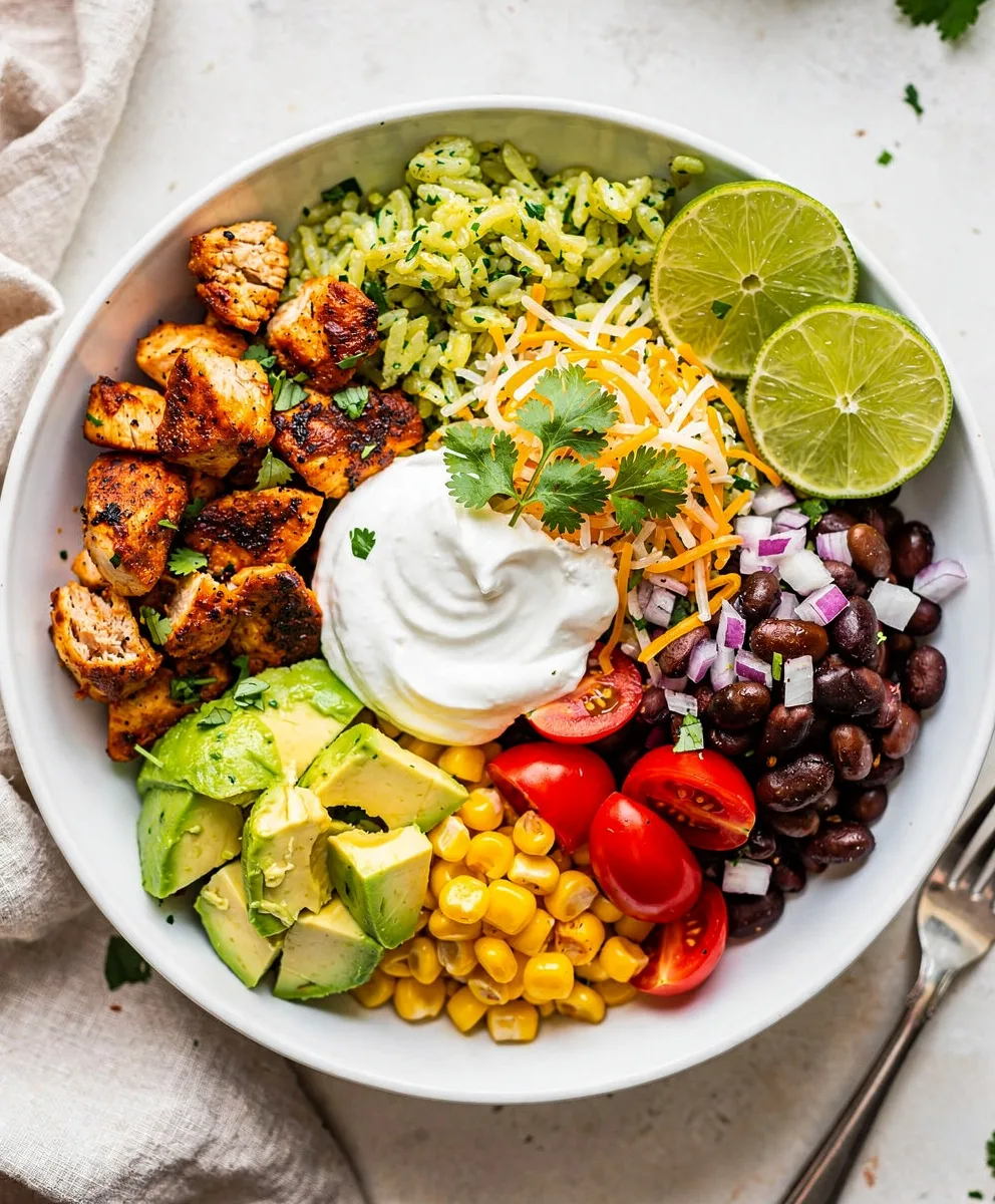 A vibrant and customizable one-bowl meal featuring smoky spiced chicken, zesty cilantro-lime rice, and fresh toppings. Perfect for a quick weeknight dinner or easy meal prep, delivering restaurant-quality flavor with minimal cleanup.