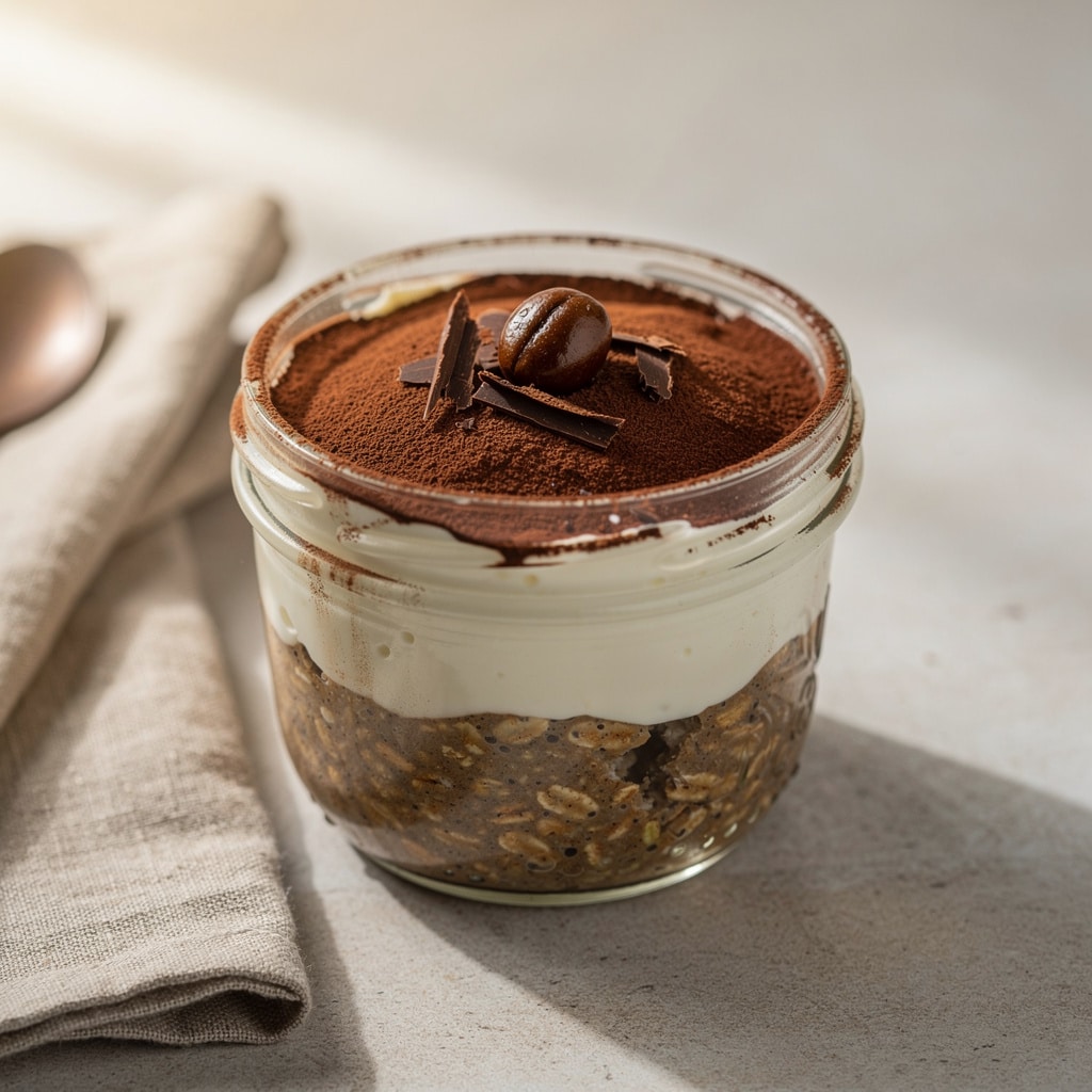 Spoon the creamy yogurt mixture evenly over the top of the coffee oat base. Do not stir. Place the lid on the jar and refrigerate for at least 6 hours, or ideally overnight. Just before serving, dust the top generously with unsweetened cocoa powder to complete the tiramisu illusion.